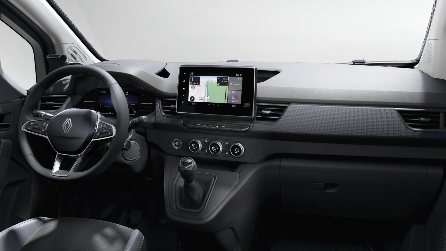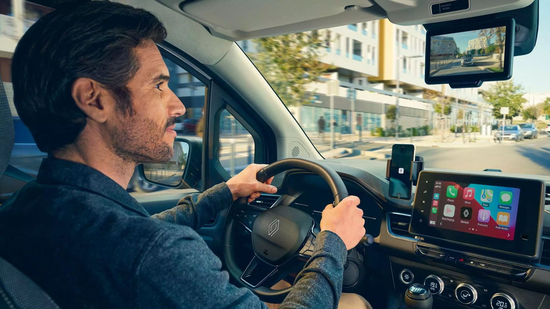 Renault Kangoo Van je vybaven moderními technologiemi, které usnadňují každodenní práci. Multimediální systém Easy Link s 8" displejem a funkcí zrcadlení smartphone nabízí tu nejmodernější konektivitu. Vůz je dále vybaven držákem na telefon, který lze umístit před řidiče na pravou nebo levou stranu od volantu, což umožňuje pohodlné ovládání všech funkcí.